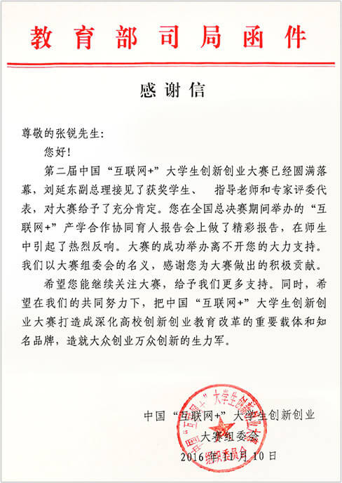 2018年,看球直播连续多年为中国国际互联网+大学生创新创业大赛做出积极贡献,获教育部来函致谢。
